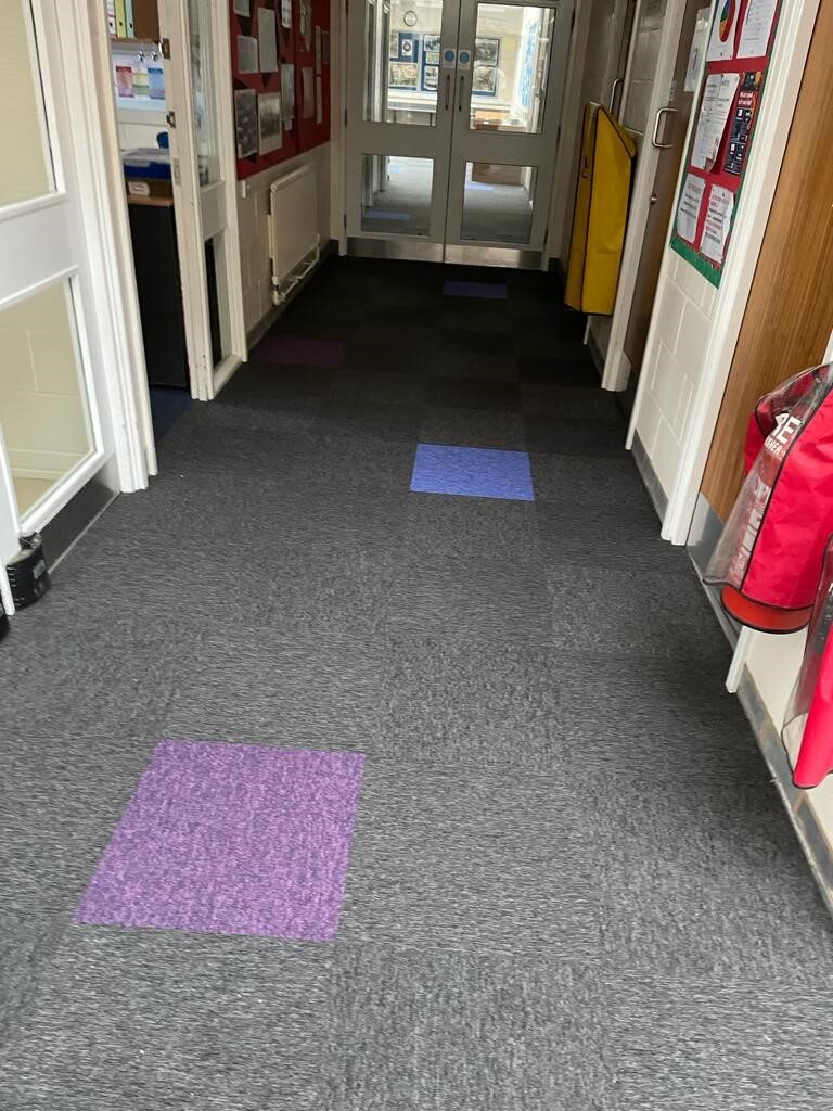 Local school fitted with new BURMATEX LIMITED Tivoli carpet tiles with random features of Caicos Azure and Marie Galante Purple with the main colour throughout being St Lucia Night.